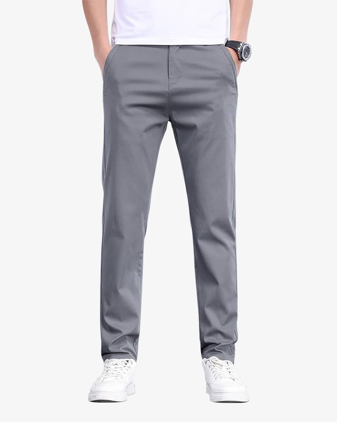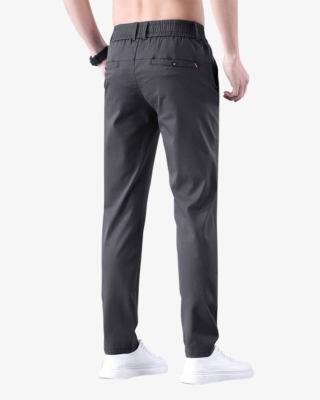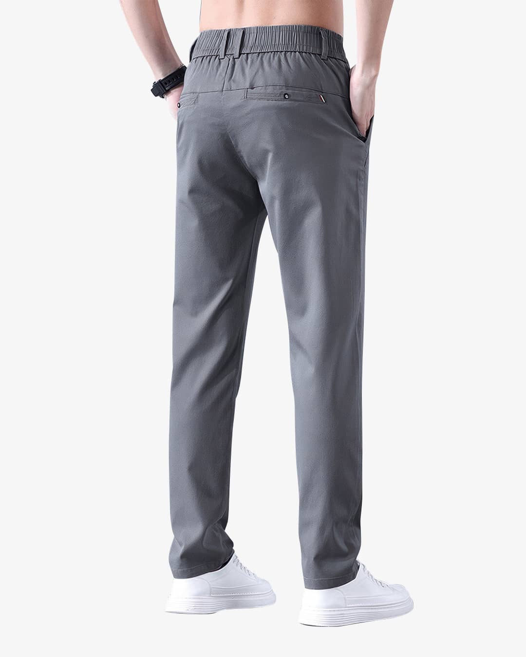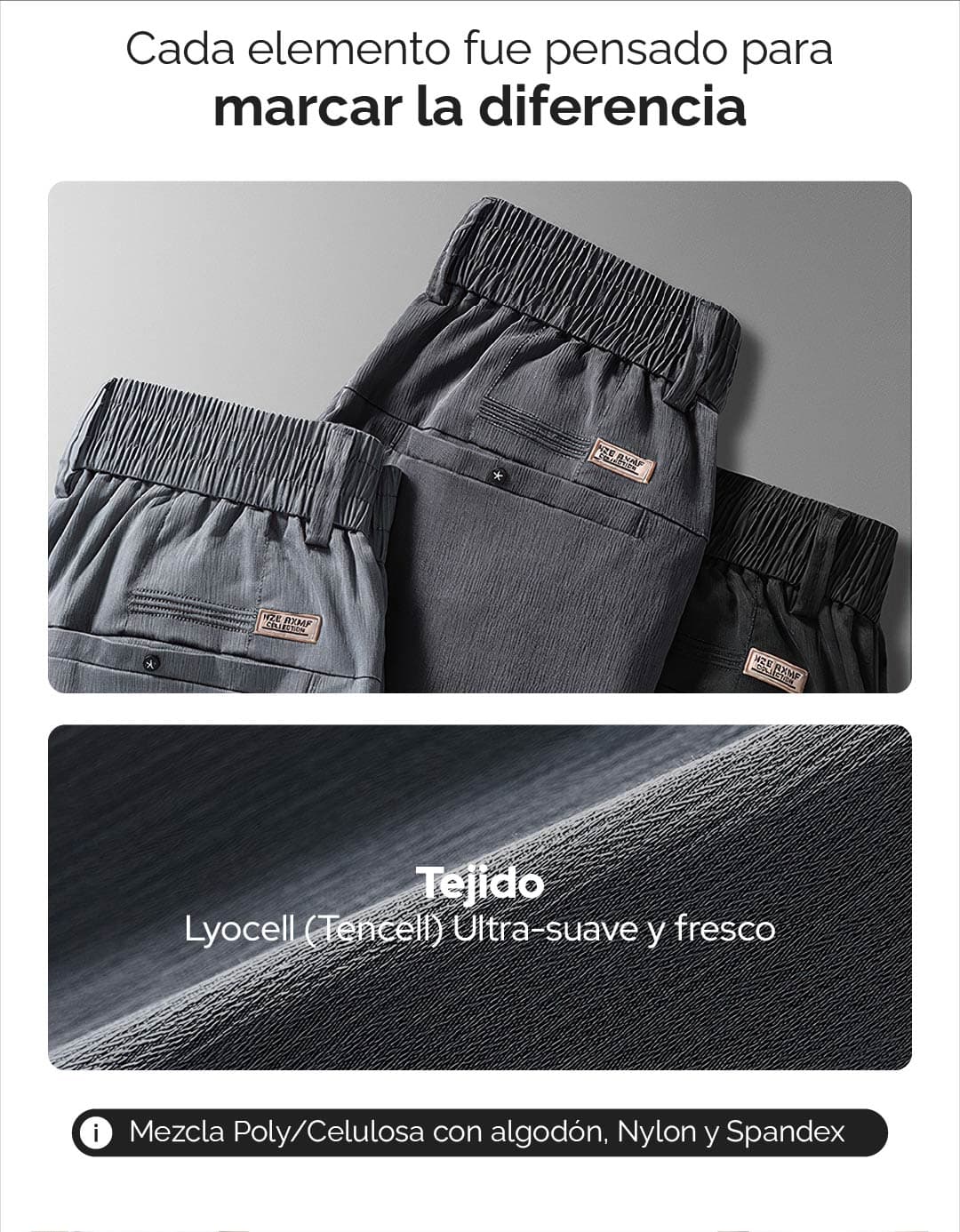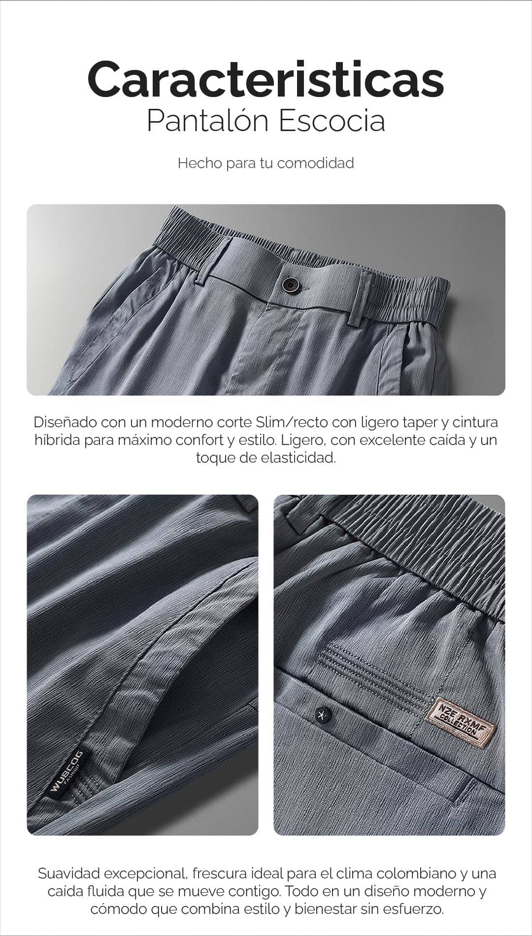 La cintura con resorte elimina la necesidad de correa, asegurando un ajuste perfecto sin incomodidad. Con bolsillos laterales amplios y un bolsillo trasero con botón personalizado.
